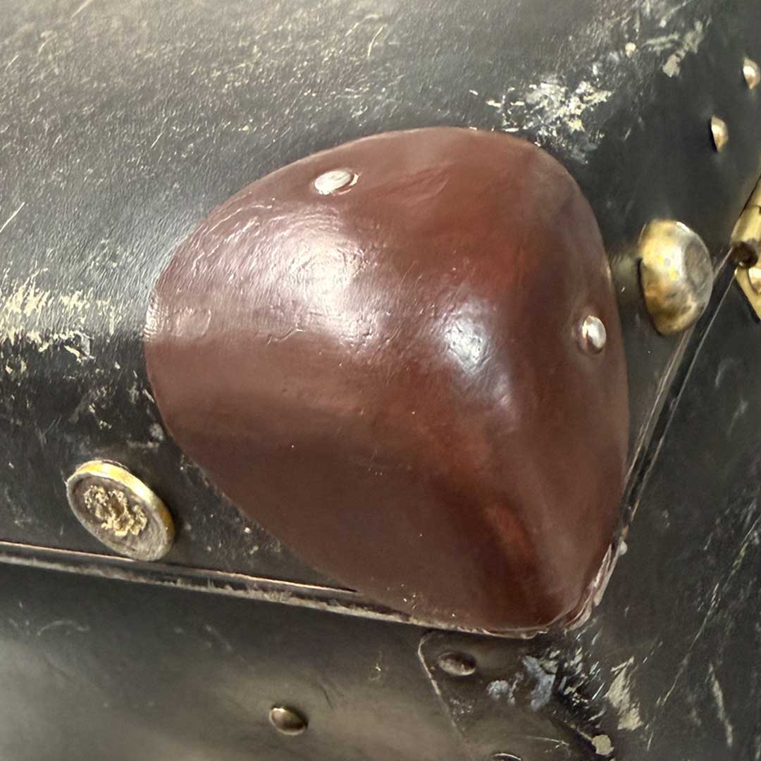 擦れて色落ちしたパーツを補色する修理で、キズなどを目立たなくします。今回は破損の激しい箇所があったため、革パーツを作製し接着、パテで形成してから顔料塗装をしています。