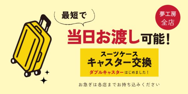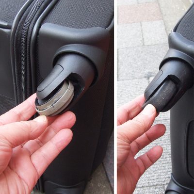今回はスーツケースのキャスター部穴あき修理をご紹介いたします。 ボディ割れ(8㎝程度 税込16,500円~)と同様の修理となります。 Before After 修理完了! キャスター周辺は負荷が強くかかるため、修理後の強 […]